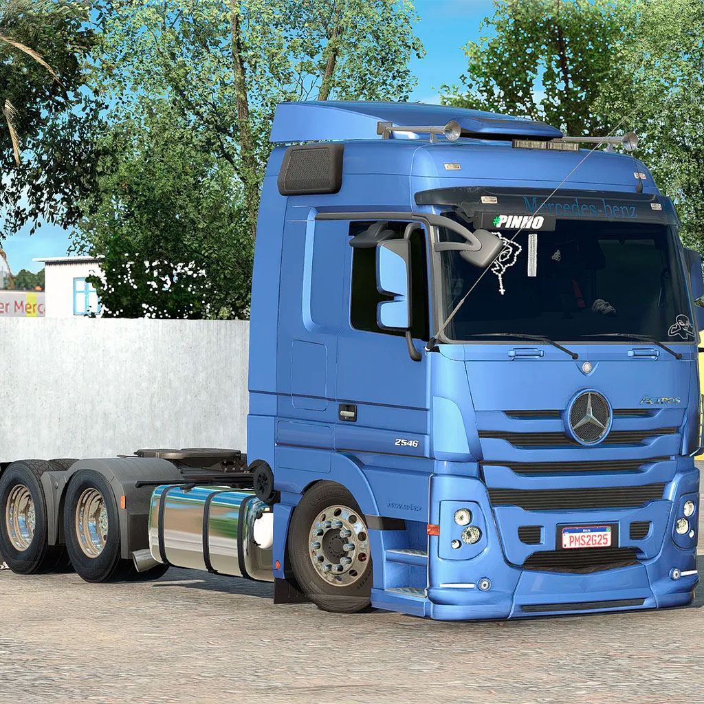 Mod MERCEDES ACTROS 2546 Completo com mais de 80 acessórios, pack de skin incluso, 2 variações de chassis (padrão e rebaixado), compatível com vários pack de som.